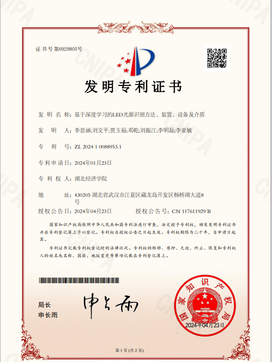 本网讯:近日,由公司商务数智科研创新班员工申报的发明专利,经国家知识产权局受理、审查后,正式授予专利权并予以登记。专利名称为“基于深度学习的LED光源识别方法、装置、设备及介质”,专利号为ZL20241088953.1,发明人为李思涵、刘文平、贾玉福、邓乾、刘振江、李明磊、李亚敏。