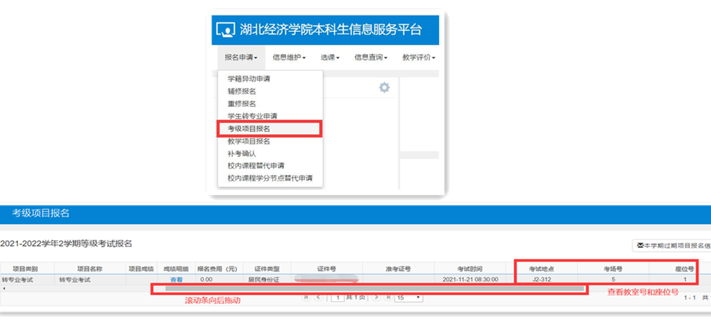1.考生进个人教务系统,在“报名申请—考级项目报名”中查询考场和座位号(需向后拖动滚动条),操作见附件1。