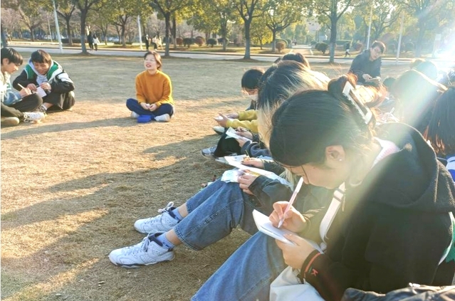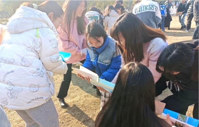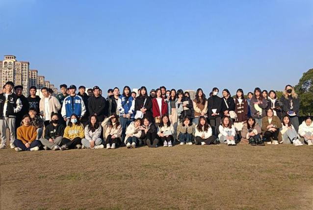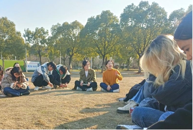 活动开始第一项,各班班长清点人数后以十人为单位进行组队,开展热身游戏“齐心协力”。该游戏以书本为道具,各组成员接力合作进行乒乓球传递,最终将乒乓球传送到终点纸杯中,根据名次角逐发放奖品。同学们通过游戏缓解学习压力,以实践贯彻团结精神。