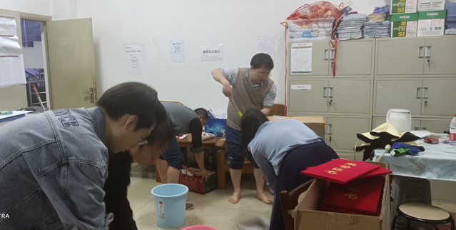 为确保办公室重要材料及物品无损坏,孙书记立即带领大家开始进行室内安置及排水工作,陶书记迅速将电脑主机搬离地面,员工吴文迪和周越也加入到“排水”工作中,大家齐心协力将办公室的水有序排出,对室内资料物品进行了合理安置。连续作战两个小时,才最终将积水排干。