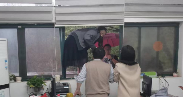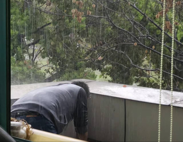 面对突如其来的水患,郑路老师二话不说,脱了鞋子就跨过窗台,检查露台的堵水情况,方周然老师也紧随其后。楼栋管理员大叔也赶上楼来,加入“治水”队伍,迅速摸排堵塞点。