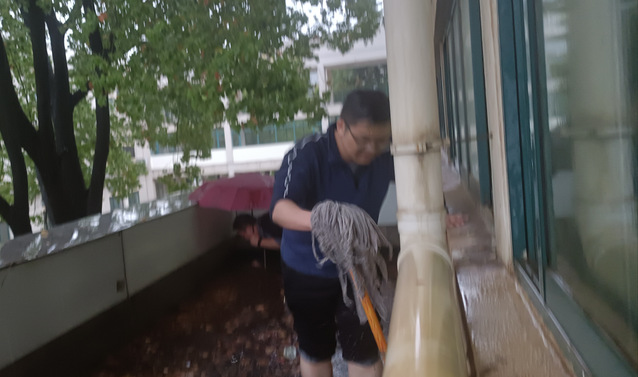 在师生的共同努力下,目前露台的堵塞点已经疏通,办公室的积水已经清理干净,用电也恢复了正常,未造成任何的财产损失。