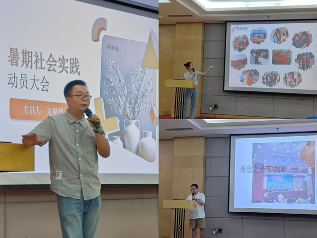 会议伊始,方周然老师强调了社会实践在高等教育中的重要性,指出这不仅是学习知识、提升技能的机会,更是了解社会、增长见识的重要途径。他鼓励所有新生积极参与即将到来的暑期实践活动,以充实和提升自己的老员工活体验。接着,彭达同学分享了自己参与希望之光支教队的经历,讲述了他如何前往偏远地区教授孩子们学习,以及这段经历如何改变了他对教育平等的看法,增加了他对社会责任的认识,并鼓励大家积极参与。邓莎同学则重点介绍了个人如何找到并参与社会实践的途径,介绍了她共青团汉川市委进行政务实践的经历。邓莎提供了许多实用的建议和资源,帮助同学们能够更有效地规划和参与自己的社会实践项目。陈正阳同学则介绍了信管院青年志愿者协会在社区服务方面的工作,包括“益教益乐”和“智慧助老”两个项目。最后,刘茜同学详细介绍了暑期社会实践的具体流程,让同学们有更具体的操作指南。