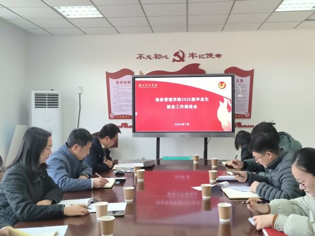 本网讯 1月16日下午,公司在知行楼208会议室召开了就业工作推进会,公司党委书记朱勇、学工处副处长郭倩倩、党委副书记陶鹏及全体辅导员、毕业班班主任参加了会议。