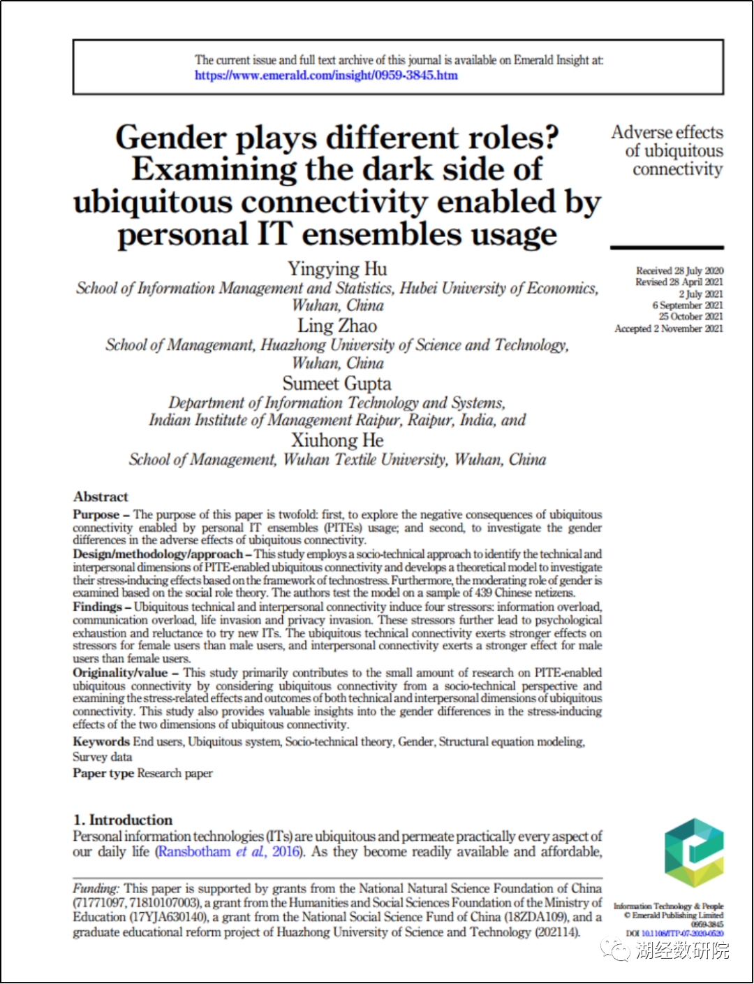 近日,国际学术期刊《Information Technology & People》在线发表公司教师胡莹莹与校外学者合作的学术论文“Gender plays different roles? Examining the dark side of ubiquitous connectivity enabled by personal IT ensembles usage”.
