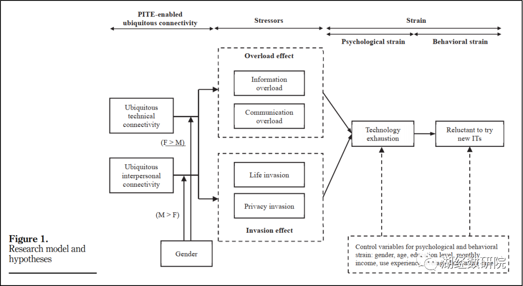 研究发现:泛在技术连接和泛在人际连接引发了四种压力源——信息过载、通讯过载、生活侵犯和隐私侵犯,这些压力源会导致用户在心理上产生疲惫感,进而导致拒绝尝试新技术的行为。此外,该研究还发现,泛在技术连接更容易给女性带来压力源,而泛在人际连接更容易给男性带来压力源。该研究对于理解个人IT集合使用背景下用户技术压力的产生机制提供了有价值的见解,对于IT服务商和社会如何预防和减弱IT技术的潜在危害也有一定指导意义。
