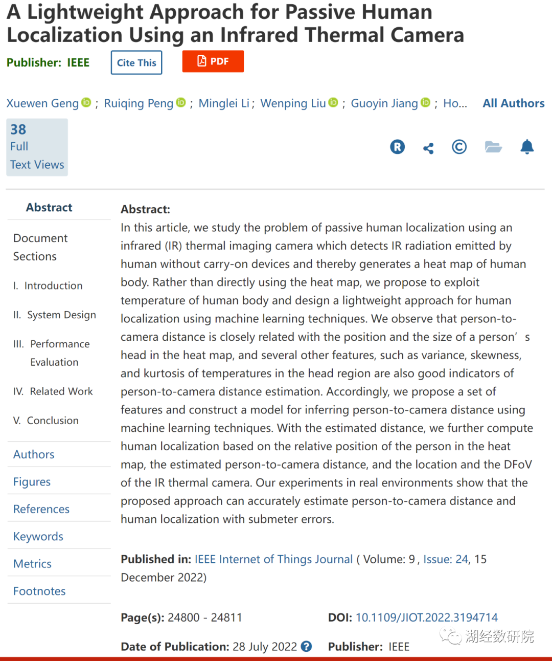 近日,公司刘文平教授团队在物联网领域国际顶刊《IEEE Internet of Things Journal 》发表了题目为《A Lightweight Approach for Passive Human Localization Using an Infrared Thermal Camera》的学术论文(DOI:10.1109/JIOT.2022.3194714)。公司彭瑞卿博士为共同第一作者,刘文平教授为通讯作者。