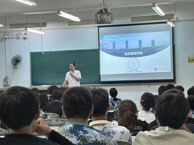 彭瑞卿以“专业初识、走进数管”为题,从院系介绍、专业发展历程、人才培养体系、发展前景、学习建议等方面,向同学们详细介绍了大数据管理与应用专业的基本情况。他表示,大数据管理与应用作为“新”专业,同学们要有扎实的理论基础,养成自主学习的习惯,着重提升硬核能力,掌握数据技能,才会在未来拥有更多的选择空间。他寄语新生:“希望同学们砥砺前行、筑梦未来,祝愿每一位同学度过一个精彩丰富的大学四年生活。”