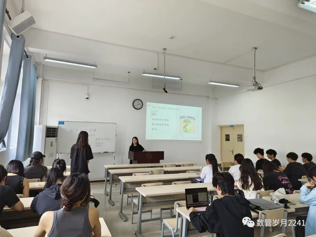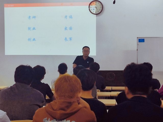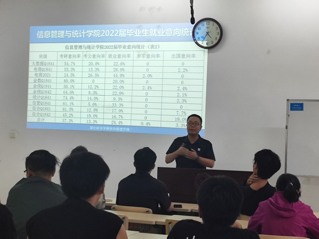 接着,方周然通过具体数据向同学们展示了上一届毕业生的毕业意向和考研情况,并且客观分析了当前的社会压力与就业形势,为同学们的职业生涯规划起到了一定的指示作用。